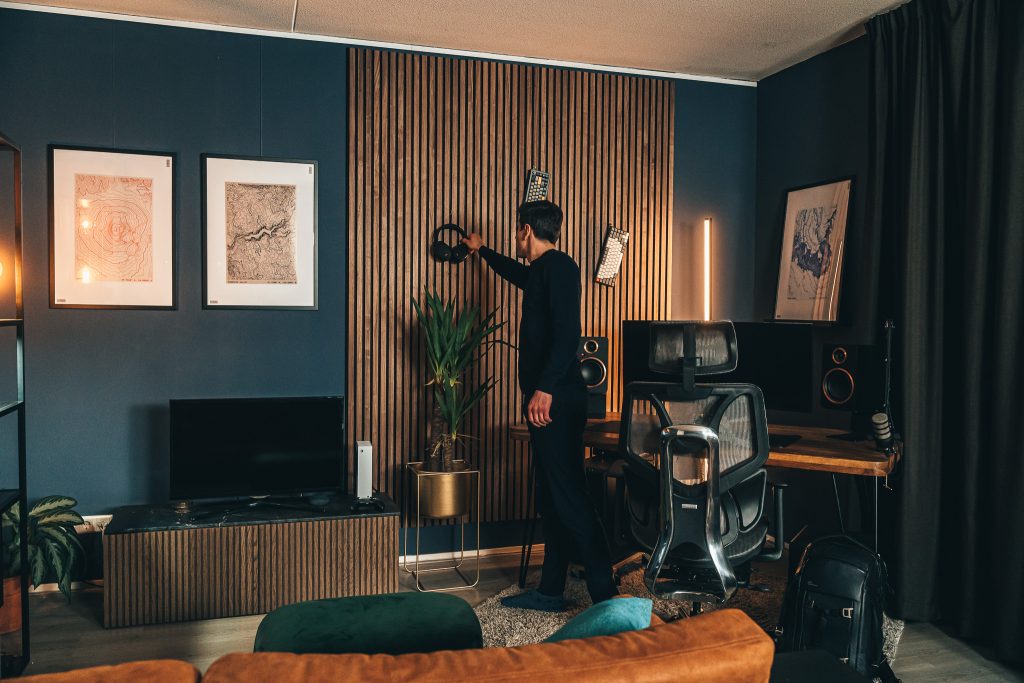 Amar heeft met veel enthousiasme gekozen voor de prachtige Walnoot panelen, die perfect matchen met de diepblauwe muur in zijn ruimte.