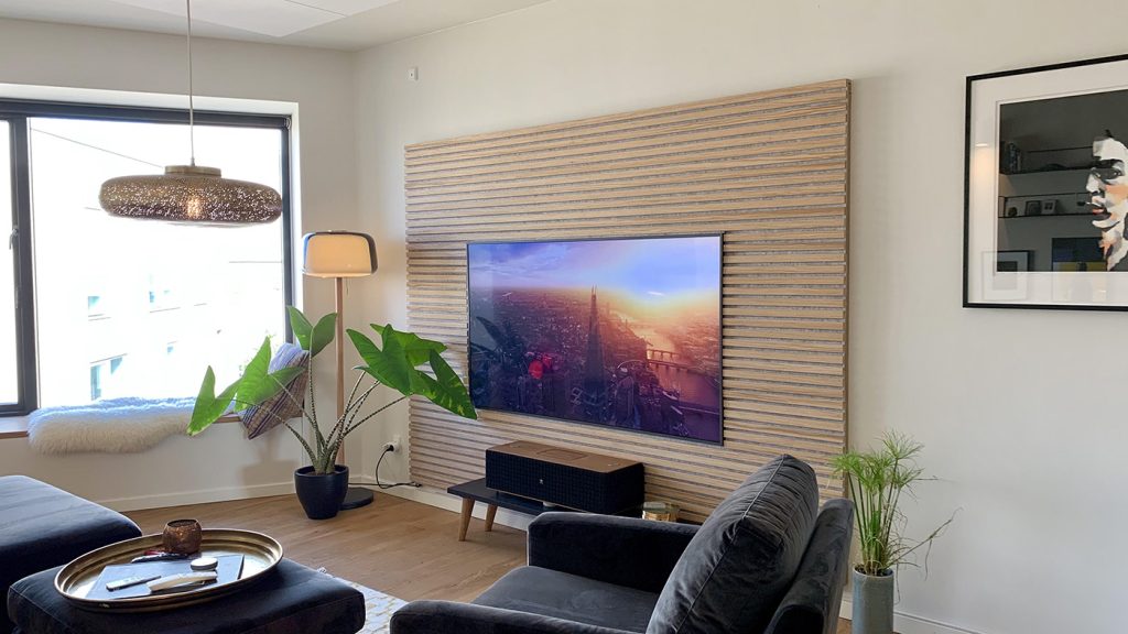 De kleur en het materiaal passen perfect bij de lichte houten vloer van hun huis en versterken het gevoel van verbondenheid met de natuur rondom. Voor Annica en Björn waren blij dat de Akupanels niet alleen de akoestiek verbeterden, maar ook een mooi interieurdetail toevoegden.