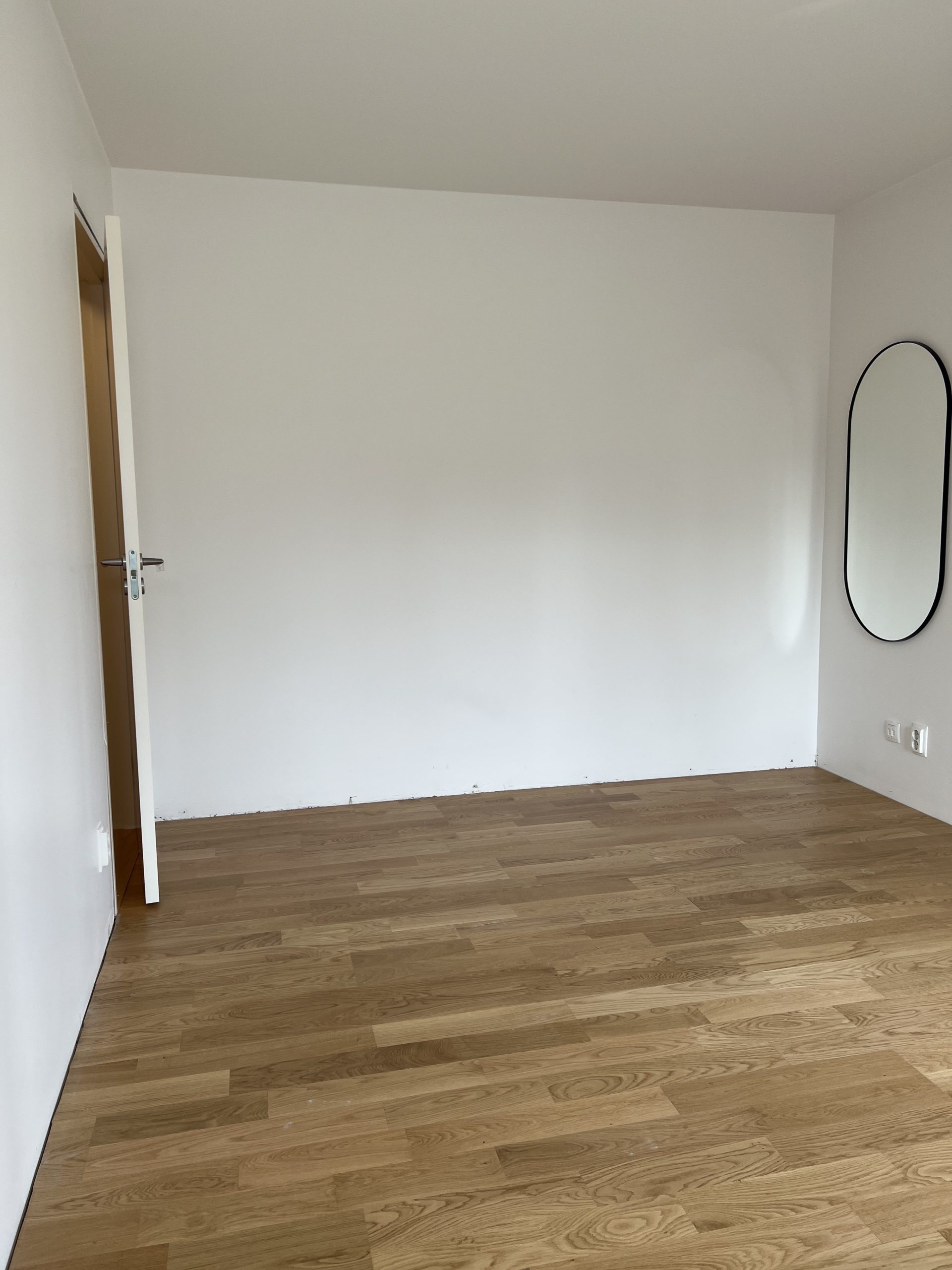 Une pièce blanche sans point d’ancrage devient un cocon doux et équilibré. Le mur du fond habillé de Chêne Classic feutrine grise offre à la tête de lit un véritable appui.