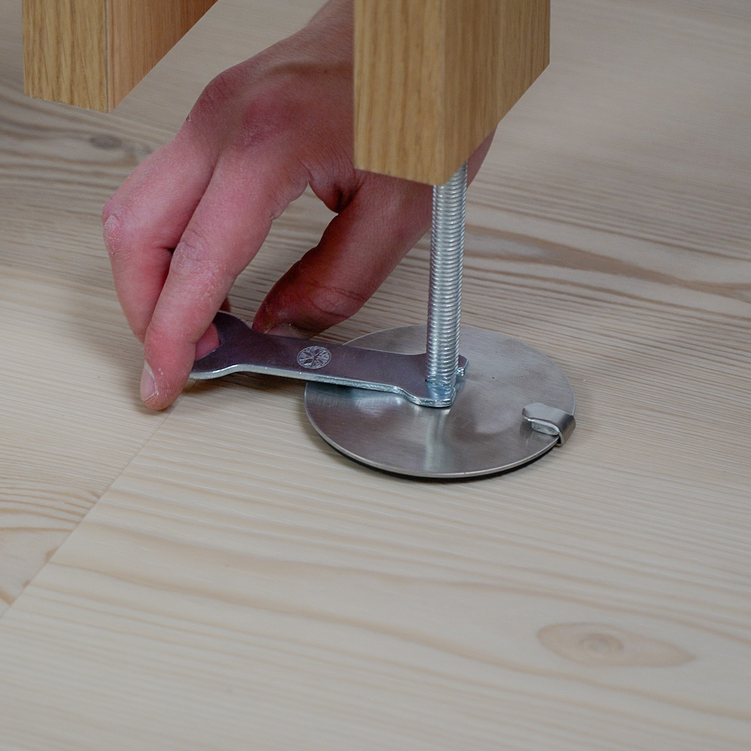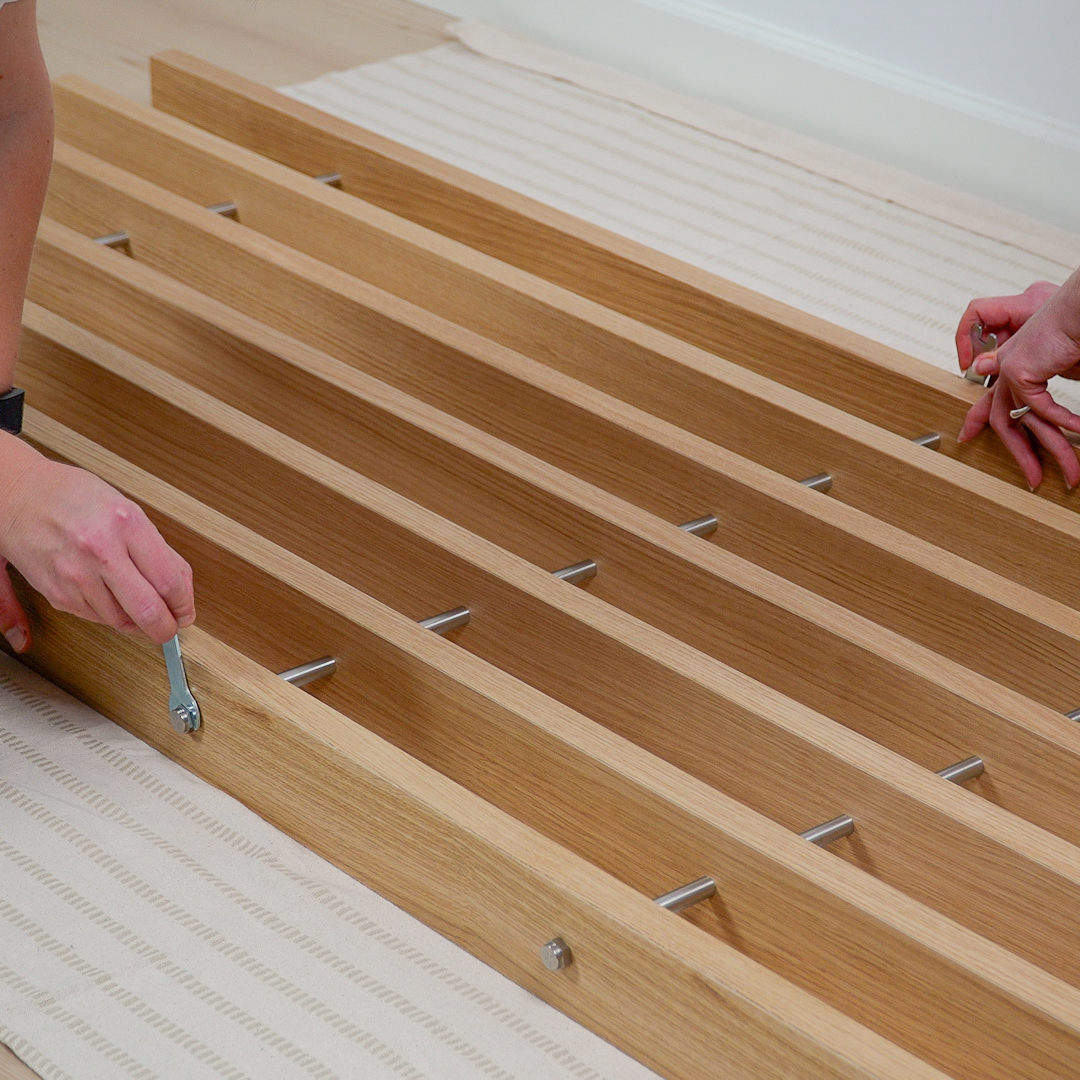 Embrace est installé à l’aide d’un système de tension qui permet aux modules de se tenir en toute sécurité entre le sol et le plafond. Pour plus de stabilité, le système doit être fixé avec des vis à la fois dans le sol et au plafond.
