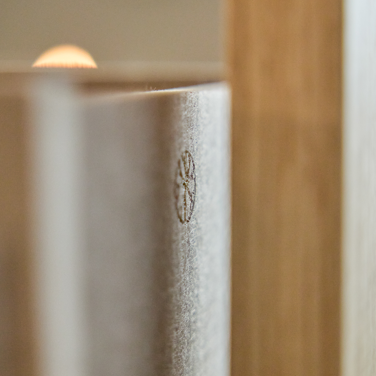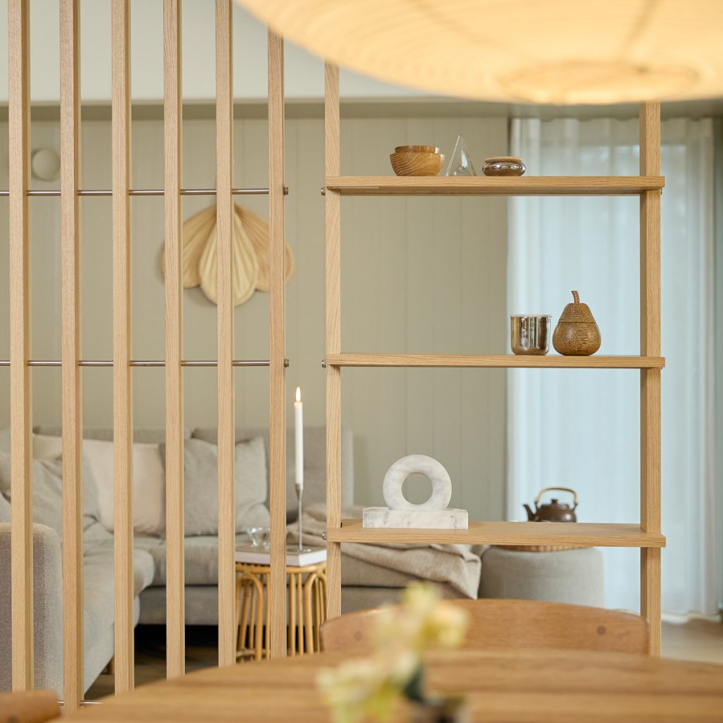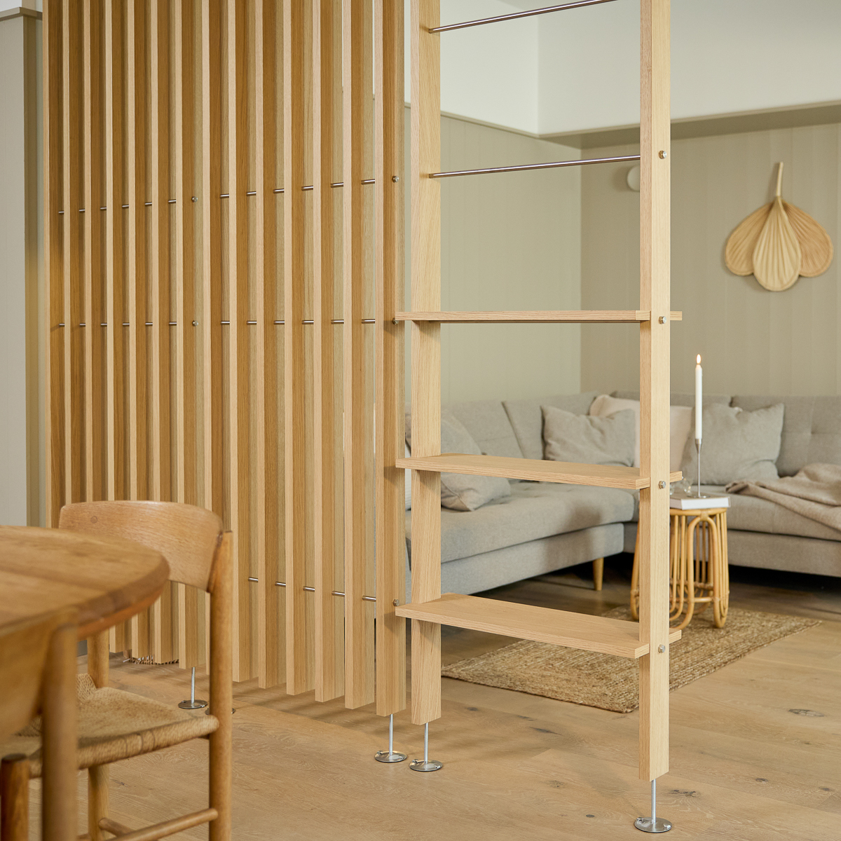Embrace est construit en placage de chêne et en acier inoxydable et se compose d’éléments modulaires qui peuvent être agencés et ajustés au fil du temps. Il est conçu pour diviser l’espace tout en gardant les pièces ouvertes et utilisables.