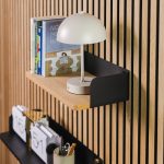 L’Étagère à livres est fabriquée en chêne massif et en acier thermolaqué. Elle s’installe en quelques minutes et se fixe directement sur vos panneaux Akupanel, sans aucun outil.