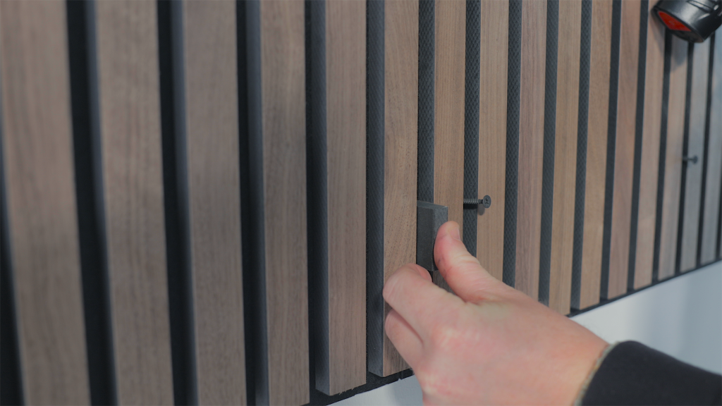 Nu ben je klaar om de panelen te monteren. Schroef het eerste akoestische paneel van 60 cm vast aan de muur door de schroef (35 mm) door het akoestische vilt en in de muur te schroeven. Controleer of het paneel recht is gemonteerd door een waterpas te gebruiken tijdens het proces.